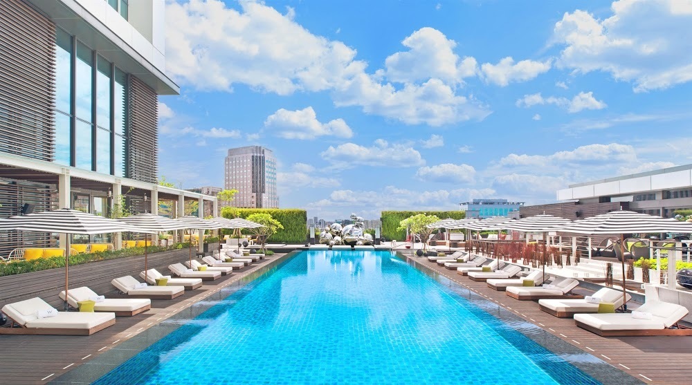 步行7分鐘可達捷運六張犁站。頂樓的天際泳池非常漂亮,適合親子同樂