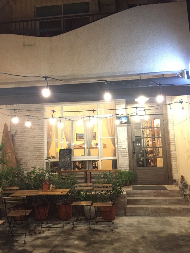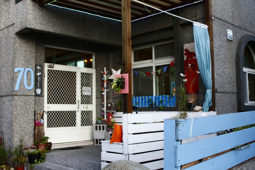 鮮艷又可愛的建築外觀,搭配綠油油的庭院及藍藍的天空,讓人心情愉悅。